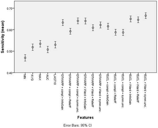 The mean sensitivity (shown in Figure 6, with 95% confidence intervals as error bars) in the datasets with common features was between 46.9% (45.39–48.41%) and 53.44% (51.94–54.94%). The use of cluster taxonomies improved the mean sensitivity of Naïve Bayes models to 66.54% (65.21–67.87%). In this case, the best result was achieved in the dataset in which the clusters were obtained using Euclidean distance and Ward linkage, although there was no statistically significant difference from DTWARP combinations with complete linkage (InfoGain and symmetrical uncertainty feature selection) or with Ward linkage (InfoGain feature selection). The performance of the ReliefF feature selection was also worse when sensitivity was used as the metric for all of the combinations of distance measurements and linkage approaches.