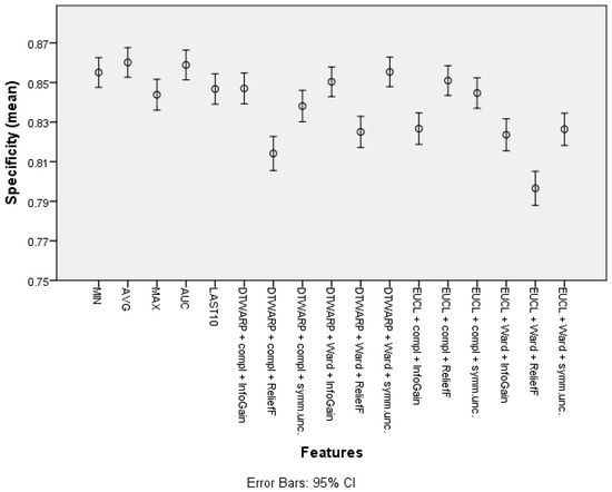 The mean specificity (given in Figure 7, with 95% confidence intervals as error bars) in the datasets representing the common features of the sensor response curve was between 84.38% (83.6–85.16%) and 86.02% (85.27–86.76%). When cluster taxonomies were used instead of common features, the specificity decreased in most cases. The datasets in which the cluster cuts were obtained using ReliefF feature selection had the worst specificities, but InfoGain and symmetrical uncertainty provided good results, in which the difference from the specificities obtained using common features was 1–2 percentage points.