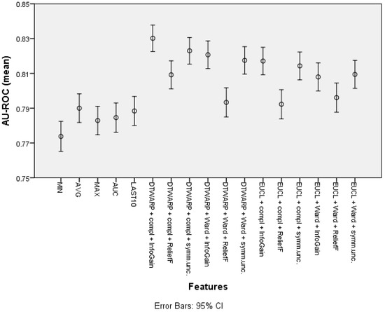 The mean area under the ROC curve (presented in Figure 8 with 95% confidence intervals as error bars) was lower in the datasets in which the common features were used; it ranged from 0.774 (0.765–0.782) to 0.790 (0.782–0.798). The AU-ROC was also lower in the datasets in which the cuts in taxonomies were chosen using ReliefF feature selection. The best result was obtained in the dataset in which the combination of DTWARP distance measurement and complete linkage was used together with InfoGain feature selection to select the best cuts in the cluster taxonomies; it was 0.830 (0.823–0.838). However, in most cases, the AU-ROC differences among the cluster taxonomy-based datasets were not statistically significant. Nevertheless, they differed significantly from the datasets in which the common features were used (except the cluster taxonomy-based datasets in which ReliefF was used to select the best cuts in the taxonomies).