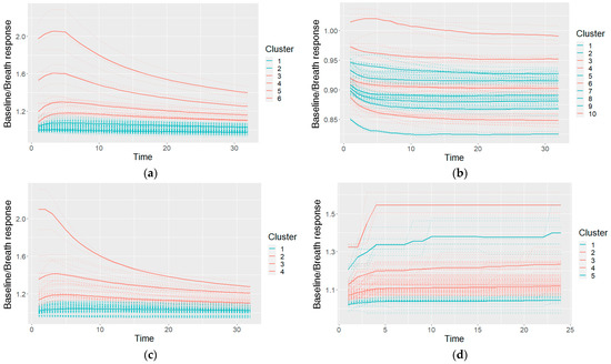 An example of the characteristic shapes used in a Naïve Bayes model: a taxonomy for GNP sensor responses cut at six clusters (a), taxonomies of two other GNP sensors cut at 10 and four clusters (b,c), and one MOXD sensor at five clusters (d); the dashed lines shows individual measurements, and the solid bold lines show the cluster-characteristic shapes.