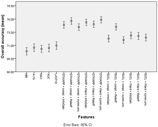 The overall accuracy (the mean values and 95% confidence intervals are shown in Figure 5) in the common feature datasets was mostly ~73.7% (95% CI: ~73.0–74.4%), with the best overall accuracy being shown by the average signal level, which was 74.21% (73.5–74.91%). When clusters were used instead of common features, the overall accuracy improved. The data subsets where the ReliefF feature selection approach was used showed the worst results in almost all of the distance and linkage combinations. The best overall accuracies were achieved in the datasets where the clusters were obtained using DTWARP distances. All of them were significantly better than the common features.