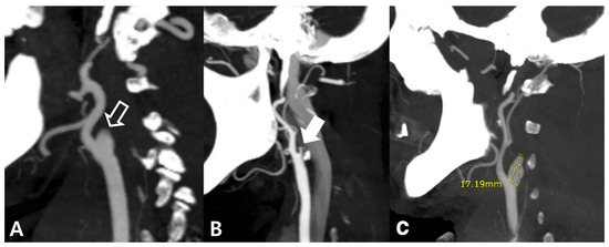 Images of the proximal internal carotid artery occlusion on computed tomography angiography ((A): blunt shape, empty arrow; (B): not-blunt shape, white arrow; (C): length of the ICA stump measurement).