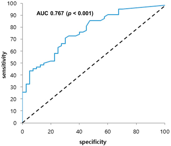 Multivariate logistic regression analysis was performed to identify the factors the localization of the true occlusion site. The non-blunt shape (OR = 646.584; CI = 21.703–19263.187; p < 0.001) and the length (OR = 0.696; CI = 0.535–0.904; p = 0.007) of the ICA stump and atrial fibrillation (OR = 0.024; CI = 0.002–0.340; p = 0.006) were significant factors (Table 3). The receiver operating characteristic (ROC) curve analysis was used to determine the sensitivity and specificity for the length of the ICA stump; the length was 6.2 mm, the sensitivity was 71%, and the specificity was 70% (area under the ROC curve = 0.767; Figure 2).