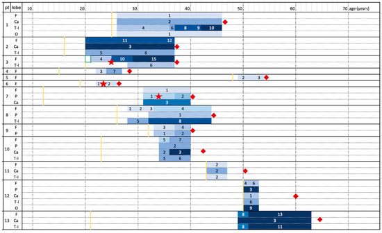 Atrophy progression timeline for each patient. Patients’ age (years) increases from left to right. The shades of blue represent MRI controls and worsening of the degree of atrophy (according to numerical values deriving from the sum of the scores of different areas, as mentioned in Table 2). Yellow line represents clinical onset; red squares represent patients’ last clinical evaluation and red stars the surgical intervention. Patient 10 and 13 died after last follow-up due to non-neurological disease. F = frontal lobe; Ca = Caudate nucleus; T-I = temporoinsular lobes; P = parietal lobe; O = occipital lobe.