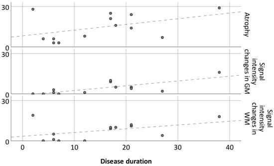 Atrophy and signal intensity changes in gray and white matter in relation to disease duration for 13 patients. Dashed lines represent linear regression for atrophy, GM SI changes and WM SI changes.