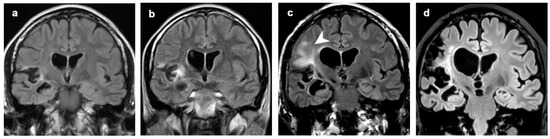 Patient 13, with stable atrophy changes during 12 years of MRI controls. Axial FLAIR images (a–c) and coronal T2-weighted image (d) at a single timepoint, showing frontal, insular and temporal atrophy with SI involving subcortical WM and cortical GM. The patient has a 25 years of disease duration with clinical onset with focal deficits, seizures and cognitive disorders; at last follow-up, EPC and behavioral disorders are present.