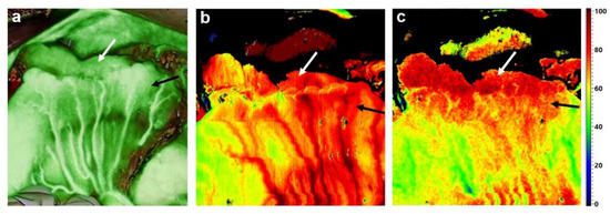 Perfusion assessment by ICG-FI and HSI during oncologic subtotal (7/8) D2-gastrectomy. After completion of the gastrojejunal anastomosis by manual suture, ICG-FI and HSI are performed to ensure sufficient perfusion of the gastric stump (white arrows) and the jejunal loop (black arrows). ICG-FI evidenced very well maintained blood flow in both segments, represented by a high color intensity of the calculated overlay (a). Both HSI index parameters, Near-infrared perfusion index (NIR-PI) (b) and tissue oxygenation (StO2) (c), also verified good perfusion.