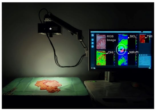 HSI is a non-invasive, contact-free method that does not require the application of a contrast medium. At our three centers, hyperspectral images are acquired with the TIVITA® Tissue System (Diaspective Vision GmbH, Am Salzhaff, Germany). The described HSI-camera is equipped with a push broom scanner, supplying images with a high spectral resolution (5 nm) in the visible and near-infrared range (500–1000 nm). The field of view is illuminated by six halogen spots (20 W each), which are directly integrated into the camera housing (Figure 2). To attain accurate measurements, the ceiling lights, as well as other bright light sources, are switched off or covered during intraoperative or ex situ image recording. After processing spectral data, an RGB (red green blue) image and four false-color images are provided by the system. Each false-color image displays a quantitative analysis of physiologic parameters: tissue oxygenation (StO2), perfusion (NIR Perfusion Index (NIR-PI)), Tissue Water Index (TWI), and Tissue Hemoglobin Index (THI). While StO2 represents the relative blood oxygenation in the microcirculation of superficial tissue layers (penetration depth~1 mm), the NIR-PI represents tissue layers in 4–6 mm penetration depth. The indices THI and TWI display the distribution of hemoglobin and water in the observed tissue area, respectively. The parameters are specified in arbitrary units (a.u.) ranging from 0 to 100 (NIR-PI, TWI, THI) or expressed in percentages (StO2), which facilitate quantitative analyses and objective data comparison. A detailed description and validation of the described parameters are presented in the publications of Holmer et al. [31,44].