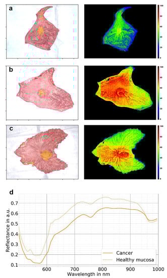 In vivo and ex vivo tissue analyses using HSI techniques revealing the invisible features of cancer enable the capturing of significantly more information from a certain scene, within and beyond the visual spectral range (from 400 to 700 nm) [46]. It has thus become possible to differentiate and identify various structures, organs, and tissue types presented in a certain scene by their specific spectral signature (Figure 3).