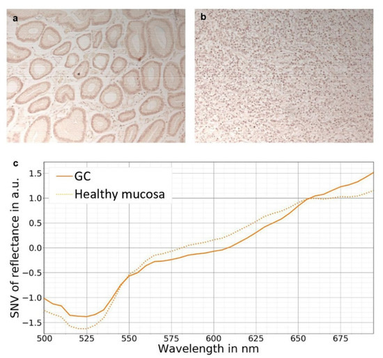Exemplary determination of reflectance spectra in hematoxylin and eosin stained stomach specimens by HSI. Specimens from gastric cancer patients were stained with hematoxylin and eosin (HE). Areas with healthy gastric mucosa (a) and gastric cancer (GC) (b) were selected and imaged by a HSI camera as described previously [50]. The RGB images were reconstructed. The reflectance spectra (c) revealed distinct differences in the classes “healthy mucosa” and GC with the highest differences at the reflectance peaks of eosin (525 nm) and hematoxylin (630 nm).