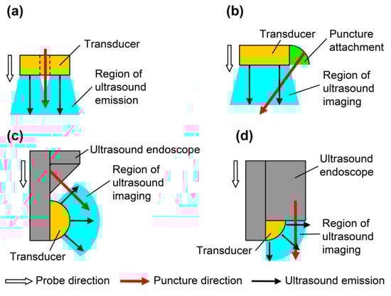 In endoscopic ultrasound-guided fine needle aspiration (EUS-FNA), the affected area is punctured obliquely using a dedicated ultrasound probe. The oblique puncturing method requires considerable skills. Puncture by forward-view EUS-FNA has also been proposed, which allows ease of puncture [13] and superior success rate and treatment time [14]. The puncture is performed in the same direction as the progression of the endoscope during forward-view EUS-FNA [15], but the ultrasound B-mode image is inclined 45° with respect to the advancing direction of the endoscope. The puncture needle is inserted from an oblique direction on the B-mode image [13]. Therefore, operability improves by matching the directions of the probe, ultrasound propagation, and puncture. Figure 1 shows the direction of the probe, transmission direction of the ultrasound wave, insertion direction of the puncture needle, and region of ultrasound emission or imaging. All directions are similar in vertical puncture (Figure 1a). In the puncture attachment (Figure 1b), the direction of the probe and the transmission direction of the ultrasound wave do not coincide with the direction of the puncture. In oblique-view EUS-FNA (Figure 1c), no directions coincide, and in forward-view EUS-FNA (Figure 1d), the directions of ultrasound transmission and puncture are different. Moreover, the vertical puncture shown in Figure 1a provides the best operability during puncture because all directions coincide.
