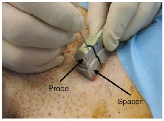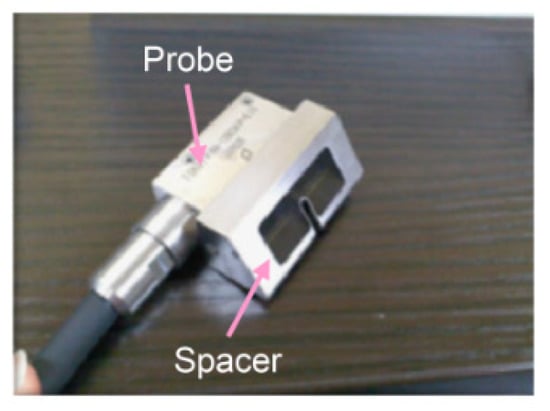 The femoral artery of a dog was punctured to detect the needle tip in the living tissue using a linear array probe (Figure S1d). A pulsed voltage of −48 V and 7 MHz was applied to the linear array probe from a pulser-receiver (Krautkramer Japan [now KJTD], Tokyo, Japan, PAL3) to measure the B-mode image. Detection of a needle at a short distance via a vertical puncture is difficult, as reported in a previous study [21]. Therefore, to detect the needle tip at a short distance, a puncture spacer (Figure 2) was used (Figure 3). The puncture was performed (Figure 3) with the puncture spacer attached. A stainless steel needle with a diameter of 0.95 mm and tip angle of 18° (Terumo, Tokyo, Japan, Surflo indwelling needle) was used to puncture the femoral artery of the dog from the U-shaped slit.