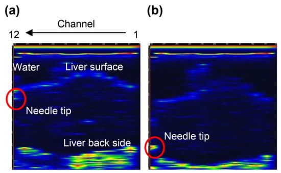 We used type A (Figure S1a) and type B (Figure S1b) ring array probes to detect needle tips in the vascular phantoms [21] and porcine liver [20]. It is necessary to investigate the effect of the slit of type C (Figure S1c) on needle tip detection. Type B without the slit detects the needle tip, as shown in Figure S8. Figure 4 shows the B-mode image with the U-shaped slit ring-type array probe (type C). Figure 4a shows the image of the needle tip near the liver surface, and Figure 4b shows the image when the needle tip was near the bottom surface of the liver. As with the Type B probe, the needle tip position could be detected in real time. The slit part did not affect the needle tip detection.