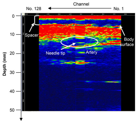 When a type D probe (Figure S1d) was used to puncture a dog, it was difficult to detect the needle tip because of noise near the surface [21]. To detect the needle tip near the surface, the results of puncture with a probe equipped with a puncture spacer are described. Figure 5 shows an image of puncturing a canine femoral artery using a puncture spacer (Figure 2). Arteries, needle tips, and body surfaces were detected in the dog, which confirmed that the needle tip can be detected using spacers, even in the vicinity of a living body surface.