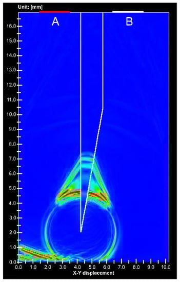 Simulation image of ultrasound propagation at the stainless needle tip. (A) is ultrasound transducer for transmitting and receiving, (B) is receiving transducer.