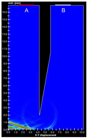 Simulation image of ultrasound propagation at the void needle tip. (A) is ultrasound transducer for transmitting and receiving, (B) is receiving transducer.