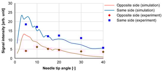 Figure 8 shows the results of the needle tip angle and received signal intensity at the experiment and simulation. The received intensity increased with needle tip angles of 10° and 15°. Because the tip angles of the injection needles used in the medical field are 12°, 15°, and 18°, large intensity values can be obtained.