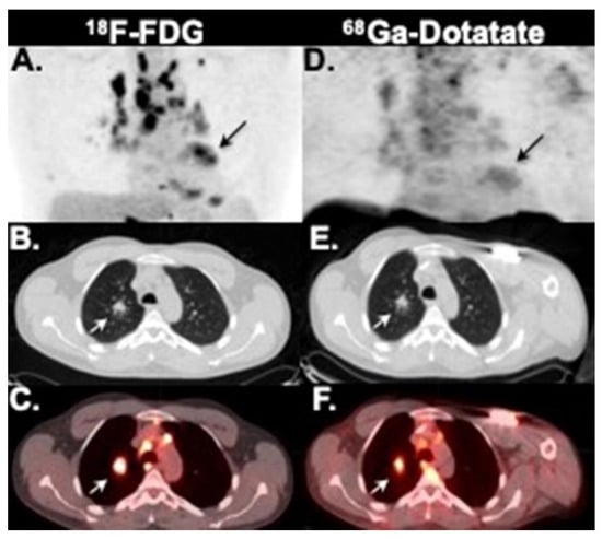 - Agrawal, K.; Bhadada, S.; Mittal, B.R.; Shukla, J.; Sood, A.; Bhattacharya, A.; Bhansali, A. Comparison of 18F-FDG and 68Ga DOTATATE PET/CT in Localization of Tumor Causing Oncogenic Osteomalacia. Clin. Nucl. Med. 2015, 40, e6–e10. [Google Scholar] [CrossRef] [PubMed]