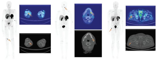 - Qin, C.; Shao, F.; Lan, X. Diffuse Increased 68Ga-DOTATATE but Unimpressive 18F-FDG Osseous Activity in a Patient with Rapid-Progressing Synchronous Multifocal Osteosarcoma. Clin. Nucl. Med. 2020, 45, 824–826. [Google Scholar] [CrossRef]