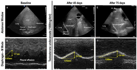 (A) Abdomen window at baseline showing extensive pleural effusion. (B) Diaphragm M-mode at baseline; diaphragm amplitude during inspiration = 1.7 cm; diaphragm thickness fraction = 37%; excursion-time index = 2.6 cm/s. Testosterone was administered 3 times 2 weeks apart (testosterone undecanoate 1000 mg/4 mL intramuscularly; NEBIDO, Bayer, Germany). (C) Abdomen window after 45 days. (D) Diaphragm M-mode after 45 days; diaphragm amplitude during inspiration = 2.6 cm; diaphragm thickness fraction = 60%; excursion-time index = 2.4 cm/s. (E) Abdomen window after 75 days. (F) Diaphragm M-mode after 75 days; diaphragm amplitude during inspiration = 2.4 cm; diaphragm thickness fraction = 50%; excursion-time index = 3.0 cm/s.