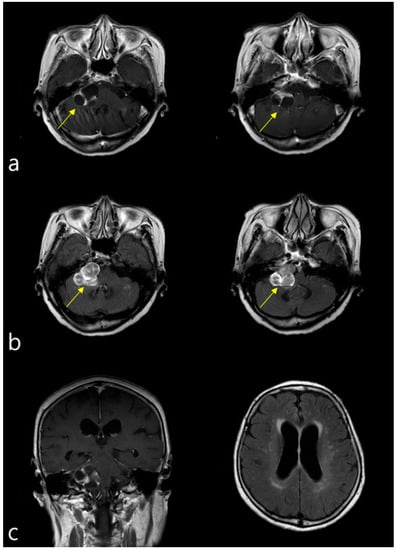 A 79-year-old woman visited the outpatient clinic of the Department of Otorhinolaryngology, Head and Neck Surgery of our university hospital with a 1-month history of right facial palsy, vertigo, dizziness, right postauricular pain, and right-sided hearing disturbance. Her medical history included bipolar hemiarthroplasty due to a right hip fracture, including total arthroplasty of both knees, in 2017. She had no history of neurological, psychological, or metabolic disorders. Physical and neurologic examinations revealed marked right peripheral facial palsy (House-Brackmann grade IV), gaze-evoked nystagmus, and cerebellar ataxic gait. No significant facial sensory deficit was observed. Based on her symptoms, injuries to her facial and vestibulocochlear nerves were suspected. Brain MRI showed a solid cystic mass with heterogeneous enhancement in the right CPA and IAC. The tumor measured 3.4 × 2.7 cm in size, with thin walls and high signal intensity similar to cerebrospinal fluid (CSF) on T2-weighted MRI images and low signal intensity on T1-weighted MRI images (Figure 1a,b). The extension of the tumor and brainstem distortion resulted in narrowing of the fourth ventricle and mild obstructive hydrocephalus due to the effect of the mass on the brainstem (Figure 1c).