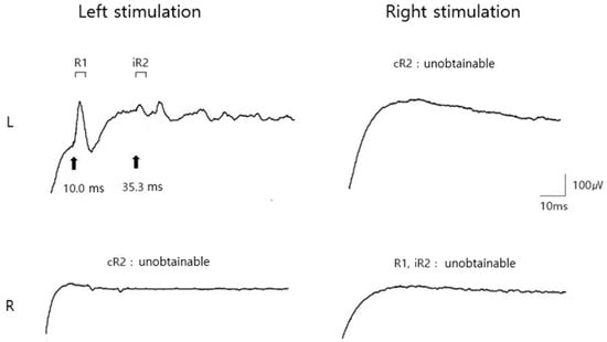 Preoperative blink reflex study results. Stimulation of the left supraorbital nerve provoked normal ipsilateral early wave (R1) and late wave (R2) responses, however did not provoke a contralateral R2 response. Stimulation of the right supraorbital nerve did not provoke ipsilateral R1 and R2 and contralateral R2 responses. Abbreviations: iR2, ipsilateral R2; cR2, contralateral R2.