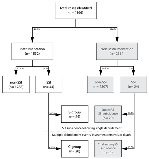 Flow chart depicting the study population and their respective categorization. Abbreviations: SSI, surgical site infection occurring post-spinal surgery; S-group, successful treatment of SSI with single debridement in the instrumentation cohort; C-group, instrumentation cohort with SSI that underwent multiple debridement interventions, instrumentation removal, or succumbed to death.