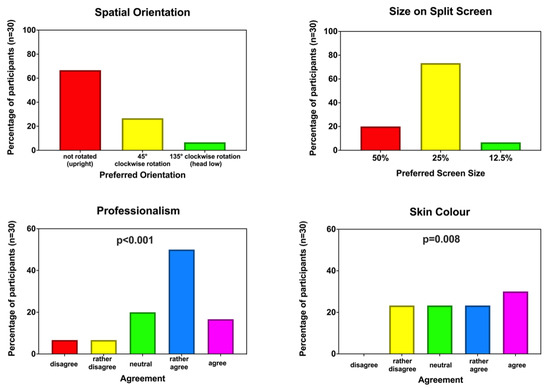 In this computer-based study part, the newly revised design was quantitatively analysed with a new group of anaesthesia providers. An iSurvey-based questionnaire (Harvest Your Data, Wellington, New Zealand) running on an iPad (Apple Inc., Cupertino, CA, USA) was used to input data. Again, all data were collected in a quiet, distraction-free setting. In a standardised manner, outlined in Supplementary Materials File S5, the basic concept of Visual-Patient-avatar was explained without clarifying each vital sign in detail. The participants were asked to answer four questions based on themes identified in the previous first, qualitative study part, and during the redesign process. The first question asked about the preferred orientation of Visual-Patient-avatar on the monitor screen (answer options: upright, 45° clockwise rotation, 135° clockwise rotation with head down). The second question used a five-point Likert scale from disagree to agree to assess the level of consent with the statement that the avatar’s revised skin colour reflects all of humanity. The third question asked about the preferred size of Visual-Patient-avatar using a split-screen mode, where conventional and avatar monitoring modalities are displayed side-by-side on the screen (answer options: 50%, 25% or 12.5% of the screen area). The fourth question used a five-point Likert scale from disagree to agree to evaluate whether the avatar’s appearance looks professional enough for medical use. The answers are presented as proportions and percentages. For the skin colour and design professionalism questions, the Wilcoxon signed-rank test was used to determine whether the sample medians differed significantly from neutral. A p-value of <0.05 was considered to be statistically significant. Microsoft Excel and Prism 8.4.1 (GraphPad Software, San Diego, CA, USA) were used to display and analyse the quantitative data.