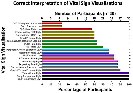 Figure 5 shows a detailed analysis of intuitive interpretation accuracy concerning vital sign visualisations. In total, the participants rated 600 visualisations. Two of 600 (0.3%) answers were missing due to app-based technical issues and 435 of 600 (73%) answers were correct. Twenty-three of 30 (77%) participants misinterpreted the two vital sign visualisations, depicting low blood pressure and ST-segment deviations. The anaesthesia personnel intuitively recognised the other 18 vital sign changes with accuracies of 57% or higher. Central venous pressure, which had hardly been recognised in the first study part, performed well in the quantitative analysis after its redesign. Low central venous pressure was interpreted correctly in 26 of 30 (87%) answers. High central venous pressure was identified correctly in 27 of 30 (90%) answers.