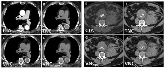 - Si-Mohamed, S.; Dupuis, N.; Tatard-Leitman, V.; Rotzinger, D.; Boccalini, S.; Dion, M.; Vlassenbroek, A.; Coulon, P.; Yagil, Y.; Shapira, N.; et al. Virtual versus True Non-Contrast Dual-Energy CT Imaging for the Diagnosis of Aortic Intramural Hematoma. Eur. Radiol. 2019, 29, 6762–6771. [Google Scholar] [CrossRef]