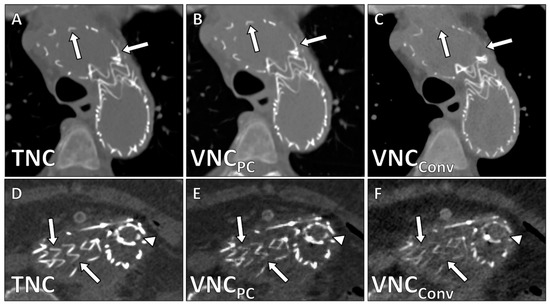 With endoleaks being the most common complication after EVAR, their safe exclusion is of paramount concern [28,29]. To be suitable substitutes for TNC-series, VNC-series must meet the following requirements: (1) reliable virtual contrast removal in the region of interest; (2) preservation of all calcifications, as erroneously subtracted calcifications might lead to the false diagnosis of an endoleak; (3) preservation of all stent struts to avoid the false diagnosis of stent fractures or displacement.