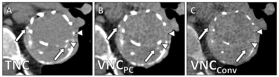 Subjective image quality was substantially higher in VNCPC-series than in VNCConv-series (4.2 ± 0.9 vs. 2.5 ± 0.6; p < 0.001). Representative images of the TNC-series and VNCConv-/VNCPC-series are presented in Figure 1.