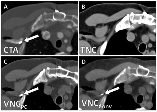 High-density contrast accumulation in the right subclavian vein (white arrow) is visible in the arterial phase scan (A) but not in the TNC-series (B). Residual non-subtracted contrast in both VNCPC- (C) and VNCConv-series (D).