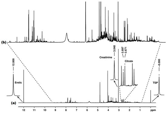 - Dona, A.C.; Jimenez, B.; Schaefer, H.; Humpfer, E.; Spraul, M.; Lewis, M.R.; Pearce, J.T.M.; Holmes, E.; Lindon, J.C.; Nicholson, J.K. Precision high throughput proton NMR spectroscopy of human urine, serum and plasma for large-scale metabolic phenotyping. Anal. Chem. 2014, 86, 9887–9894. [Google Scholar] [CrossRef]