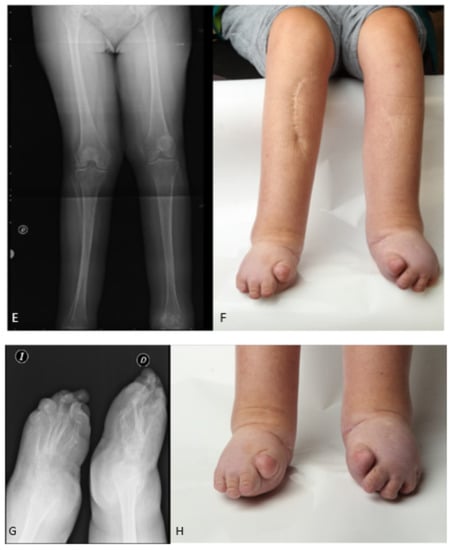 Radiologic controls. Phenotypic progression. (A) Radiological control hands in 2008. (B) Radiological control hands in 2011. (C) Radiological control hands in 2014. (D) Photography hands in 2021. (E) Serpentine fibula in 2002. (F) Photography legs in 2021. (G) Radiological control feet in 2014. (H) Photography feet in 2021. (I) Radiological control forearm in 2016. (J) Anteroposterior radiological control of the hip in 2013.