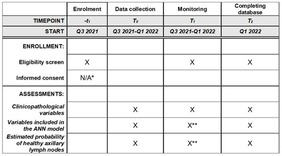 This validation study of the NILS prediction model will be a multicenter, retrospective study based on prospectively collected clinicopathological variables included in patients’ medical charts, mammograms, and pathology reports. We plan to assess the external validity and model validity of the NILS prediction model for healthy lymph nodes and evaluate the discrimination and calibration of the NILS prediction model while following the TRIPOD statement [16]. A schematic schedule of enrollment, data collection, and monitoring is provided in Figure 1. This study aims to validate the NILS prediction model, a previously published ANN-based decision-making tool that is based on retrospectively collected data at Lund University Hospital, Sweden. In agreement with TRIPOD recommendations, the data in this validation study are derived from cohorts different in both time and study sites. Thus, patients who underwent surgery for primary BC in Malmö, Sweden, in 2020 (n = 400, a temporal validation cohort) and in Helsingborg, Sweden, between 2019 and 2020 (n = 200, a geographical external validation cohort) will be identified by a national registry of cancer diagnoses, treatments, and outcomes (INCA). The data retrieved from clinical files will include age at BC diagnosis, medical history of BC, ultrasound assessment of the axilla, and clinical status of the axilla. Tumor size and localization in the breast, including laterality, multifocality, and mode of tumor detection, will be obtained from imaging assessment reports (mammography, followed by ultrasound assessment in cases of an inconclusive mammographic report). In cases where multifocality is detected by either clinical examination or any imaging modality in this study, the tumor will be considered multifocal. Tumor biology data (estrogen receptor status, progesterone receptor status, HER2 status, molecular and histopathological subtype, vascular invasion, and proliferation index Ki-67) will be obtained using preoperative core needle biopsy. Number of metastatic axillary lymph nodes will be obtained from reports of surgical pathology specimens (sentinel-node surgery and axillary dissection).