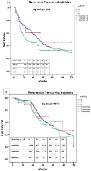 (A) Comparison of recurrence-free survival according to mGPS status. (B) Comparison of progression-free survival according to mGPS status.