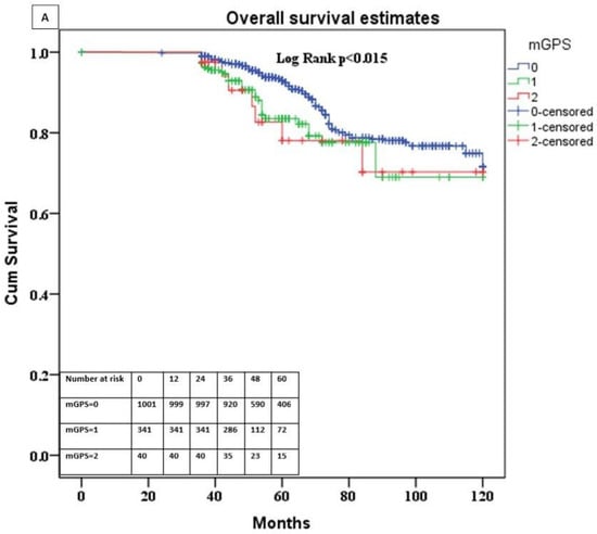 Within a median follow-up of 44 months (IQR: 36–58), 156 (11.28%) died due to general causes, while 67 (4.84%) died of BC. Kaplan–Meier survival analysis showed a significant difference in survival among patients from different mGPS subgroups. Mean overall survival for patients having mGPS of 0 was 107.3 months (CI 95% 105.1–109.5) and it was higher than the mean survival for patients with mGPS 1 of 102.1 months (CI 95% 96.2–108), and for mGPS 2 of 101.5 months (CI 95% 89.7–113.4), p = 0.015. Five-year OS was 93% (CI 95% 92–94), in patients with mGPS 0, 82.2% (CI 95% 78.9–85.5) in patients with mGPS 1 and 78.1% (CI 95% 60.4–70) in mGPS 2 patients. Five-year CSS was 98% (CI 95% 97–99) in patients with mGPS 0, 90% (CI 95% 87–94) in patients with mGPS 1, and 100% in mGPS 2 patients (Figure 2A,B).