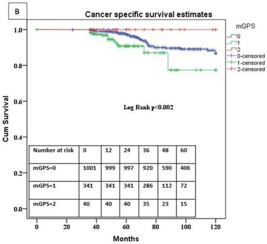 (A) Comparison of overall survival estimates according to mGPS status. (B) Comparison of cancer-specific survival estimates according to mGPS status.
