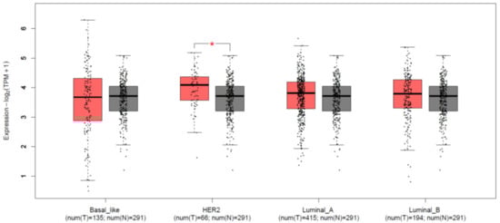 KCTD15 mRNA expression in breast cancer different subtypes and normal tissues (GEPIA). Box plots show median mRNA expression levels of KCTD15 in breast cancer tumors (red plots) and the corresponding normal tissues (gray plot). Axis units are Log2 (TPM + 1). * red = p-value < 0.01. T = tumor tissues. N = normal tissues.