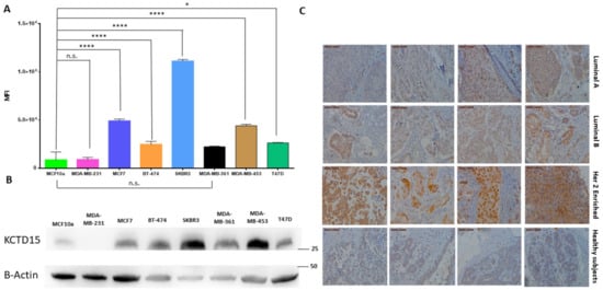 KCTD15 expression in breast cancer tissues and cell lines. (A) Bar-plots display fluorescence intensity (in terms of median of fluorescence and SEM) of KCTD15 in MCF10 (light green), MDA-MB-231 (pink), MCF7 (blue), BT-474 (orange), SKBR3 (light blue), MDA-MB-361 (black), MDA-MB-453 (light brown) and T47D (green). The error bar represents SEM. **** = p < 0.0001, * = p < 0.05. Mann Whitney T-test. Panel (B) shows KCTD15 expression using WB. Numbers represent protein marker expressed in kDa. Western blot is representative of three independent experiments with similar results. Panel (C) displayed KCTD15 expression level in breast tissues by IHC analysis: 4 Luminal A (score 2), 4 Luminal B (score 2), 4 HER2 enriched (score 3), and 4 healthy subtypes (score 0). Magnification 40×. Scale bars 50 µm.