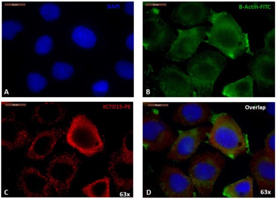 Immunofluorescence assay on SKBR3 cells. (A) Nuclei staining with DAPI (blue) (B) β-actin staining with FITC-conjugated secondary antibody. (C) Endogenous KCTD15 labeled with PE-conjugated secondary antibody. (D) Overlapping of FITC, PE, and DAPI channels. Magnification 63×. Scale bars 20 µm.