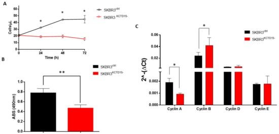CRISPR/CAS9 KCTD15 silencing reduces SKBR3 growth. (A) Cell proliferation at 24, 48 and 72 h of SKBR3 control (black line) and SKBR3KCTD15− (red line). Cell growth was expressed as number of cells/µL. Error bars represent the SD of three independent experiments. * = p-value < 0.05 (B) MTT assay of SKBR3ctrl (Black bar) and SKBR3KCTD15− (red bar) after 72 h of growth. * = p-value < 0.05, ** = p-value < 0.01, Mann–Whitney t-test. Error bars represent the SD of six independent experiments. (C) Cyclins mRNA expression levels in SKBR3ctrl (black bar) and SKBR3KCTD15− (red bar). The relative expression was determined using the 2−ΔCt method. Cyclins relative expression is shown as mean +/− SD of two technical independent experiments. * = p-value < 0.05, Mann–Whitney t-test.