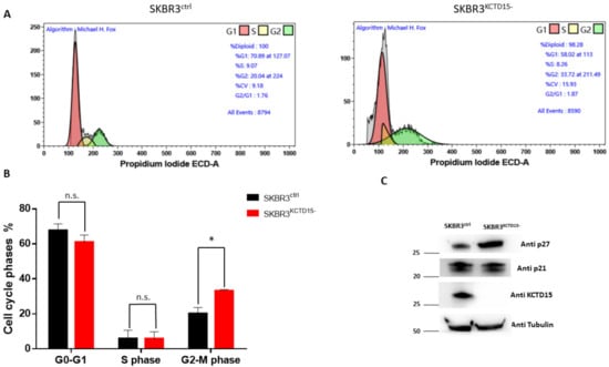KCTD15 silencing causes the G2 m alteration of the SKBR3 cell cycle. (A) Flow cytometry analysis of the cell cycle distribution in SKBR3ctrl (left) and SKBR3KCTD15− (right) cells after 72 h of active growth. (B) Histogram representation of cell cycle phase percentage, derived from three independent experiments. * = p < 0.05 Mann–Whitney t-test. Error bars indicate standard deviation. (C) Western blot of p21, p27, KCTD15 and Tubulin in SKBR3ctrl (left) and SKBR3KCTD15− (right) cell extracts after 72 h of active growth. Numbers represent protein marker expressed in kDa. Western blot was repeated twice with similar results.