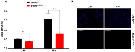 The non-tumorigenic epithelial MCF10-a cell line and human breast cancer cell lines (SKBR3, MCF7, MDA-MB-231, BT-474, MDA-MB-361, MDA-MB-453 and T47D) were obtained from the American Type Culture Collection. The SKBR3 cells were grown in McCoy’s 5A Medium Modified supplemented with 10% fetal bovine serum (FBS). On the other hand, MCF-7, MDA-MB-231, BT474, MDA-MB-361, and T47D cells were grown in RPMI-1640 medium with GlutaMAX 1% supplemented with 10% FBS, indeed MDA-MB-453 were growth in L-15 medium supplemented with 10% FBS. Finally, MCF10a cells were grown in the MEBM medium (CC-3151, Lonza, Belgium). For the generation of KCTD15 silenced SKBR3 cells, we used the CRISPR/CAS9 technology []. Briefly, SKBR3 cells were transfected with KCTD15 double nickase plasmid (sc-407663-NIC-2, Santa Cruz Biotechnology, Inc., Dallas, TX, USA) to obtain KCTD15 silenced clones (SKBR3KCTD15−). In addition to the obtained SKBR3 control cells (SKBR3ctrl), SKBR3 cells were transfected with CRISPR/CAS9 control plasmid (sc-418922, Santa Cruz Biotechnology, Inc., Dallas, TX, USA) plus pReceiver-M94 plasmid (GeneCopoeia, Inc., Rockville, MD, USA). Transfections were conducted using Lipofectamine 3000 reagent (L3000001, Thermo Fisher Scientific, Waltham, MA, USA) following the manufacturer instructions. Clones were selected with 1.5 µg/mL puromycin. For chemotherapy cytotoxicity assays, both SKBR3ctrl and SKBR3KCTD15− cells were treated with doxorubicin 2 and 5 µM for 16 h. All cell lines were cultured at 37 °C in a humidified atmosphere with 5% CO2. Additionally, MDA-MB-453 was used as an incubator without CO2.