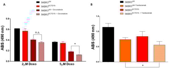 Cell viability was assessed by the MTT (3-(4,5-dimethylthiazol-2-yl)-2,5-diphenyltetrazolium bromide) assays (G4000, Promega, Italy). Both SKBR3ctrl and SKBR3KCTD15− cells were seeded in 96-well plates at a density of 8 × 103 per well. For drug treatments, cells were incubated with 2 and 5 μM of Doxorubicin for 16h and 40 μg/mL Trastuzumab (HY-P9907, MedChem Express) for 5 days as previously reported []. Absorbance values were determined at 490 nm using an automatic plate reader (Victor Nivo, Perkin Elmer, Waltham, MA, USA). MTT assays were repeated thrice with similar results.