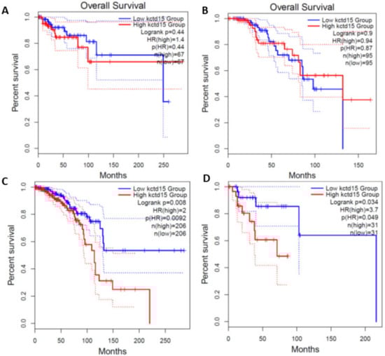 To evaluate whether KCTD15 silencing could improve the action of drugs commonly used in the treatment of breast cancer, we decided to estimate the in vitro effect of Doxorubicin, a generic chemotherapeutic agent [], and the Trastuzumab, a drug specifically used in the treatment of HER2+ breast cancer patients []. We treated SKBR3KCTD15− and the SKBR3ctrl cells with 2 and 5 µM of doxorubicin for 16 h. As shown in Figure 7A, 2 µM doxorubicin is more effective on SKBR3KCTD15− cells than SKBR3ctrl cells. Furthermore, by increasing the concentration of doxorubicin to 5 µM, the effects on cell metabolism become significantly greater than the control cells. Furthermore, as shown in Figure 7B, the silencing of KCTD15 sensitized the SKBR3 cells to Trastuzumab, showing a significantly greater effect for the HER2+ cell line compared to SKBR3 cells treated with Trastuzumab alone. Moreover, we also examined overall survival (OS) in breast cancer patients who received treatment, either chemical or hormonal, using the Kaplan–Meier plot as a function of KCTD15 expression levels. We analyzed breast cancer patient data from the TCGA database using the GEPIA portal. As shown in Figure 8, there were no significant differences between Triple Negative and Luminal B breast cancer patients in terms of OS, which was determined by dividing the patients into the two subgroups (low and high KCTD15 expression, Figure 8A,B). On the other hand, significant differences are reported for Luminal A and HER2+ breast cancer patients (Figure 8C,D). These results suggest that high mRNA expression levels of KCTD15 are associated with a poorer survival of patients in a subtype-specific manner.