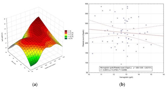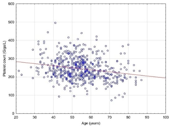 In the case of hemoglobin concentration value, a slight positive correlation was found (r = 0.21; p < 0.0001), and in the case of platelet count, a weak negative correlation was found (r = −0.22; p < 0.0001—Figure 1).