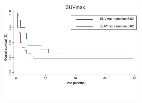 The Kaplan–Meier plots showed that there was no significant difference between patients with SUVmax ≤ median (6.62) compared to those with SUVmax > median (6.62), p-value = 0.0905 (Figure 1).