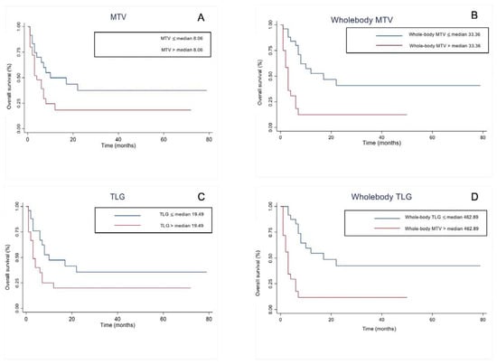 Kaplan–Meier curves for overall survival in restaging melanoma with respect to metabolic tumor volume (MTV) (A), whole-body MTV (B), total lesion glycolysis (TLG) (C), and whole-body TLG (D).